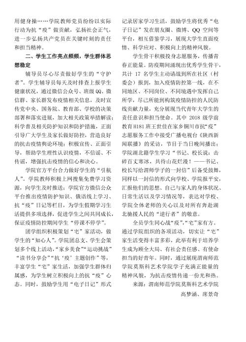 文章总结了抗击新冠疫情期间Bsports必一体育的抗疫举措以及富有特色的抗疫事例。抗疫期间,公司党总支紧紧围绕 “坚持党建引领,争当时代先锋,促进中外合作,提高教育质量”的工作思路,继续带头做好公司师生思想意识形态工作,树立坚决抗“疫”,师生齐心抗“疫”的信心。公司党员教师发挥专业特长,以“歌、舞、画、操”为媒介,勇做正能量的传播者,为正向宣传贡献自己的一分力量;员工工作亮点频频,团学组织策划系列“宅”活动、开创居家学习生活日记、“宅家”俄语学习计划等特色栏目,优秀员工志愿者主动请战,加入疫情防控第一线,尽己所能到构筑疫情防控的人民防线贡献力量。