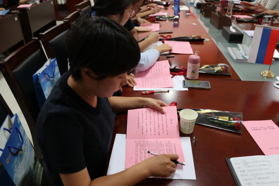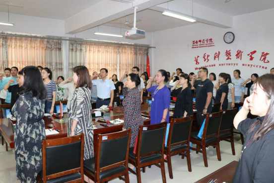 会议第一项,全体教师庄严肃立,举起右手,进行了宣誓活动:“忠于党的教育事业,贯彻党的教育方针,履行教师的神圣职责,做有理想信念、有道德情操、有扎实学识、有仁爱之心的好教师,……为员工德智体美劳全面发展,奉献智慧与力量,为党和人民的教育事业而努力奋斗!”