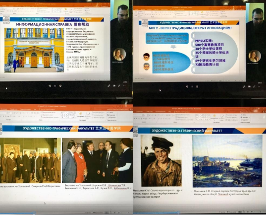 讲座中,康斯坦丁讲述了艺术与造型系的发展历史,详细梳理了1941年艺术与造型系成立以来的名师大家,展示每一届艺术与造型系主任在美术创作和美术教育上的研究成果。他还介绍了莫斯科国立师范大学艺术与造型系的课程设置、学术答辩委员会的工作、艺术与造型系历年举办的艺术展览、国际交流合作情况等。