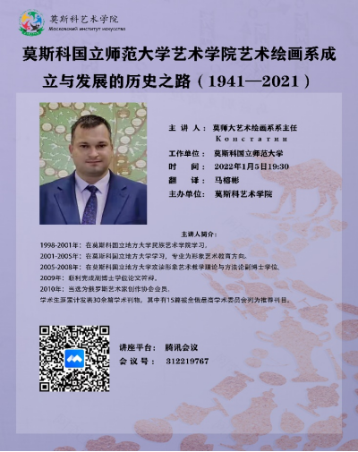 2022年1月5日晚上7:30,莫斯科国立师范大学艺术与造型系主任康斯坦丁为Bsports必一体育师生作题为“俄罗斯美术教育”的线上学术讲座,讲座由美术学专业负责人石洁主持,俄语教研室主任马榕彬担任翻译,美术学专业200余名师生参与。