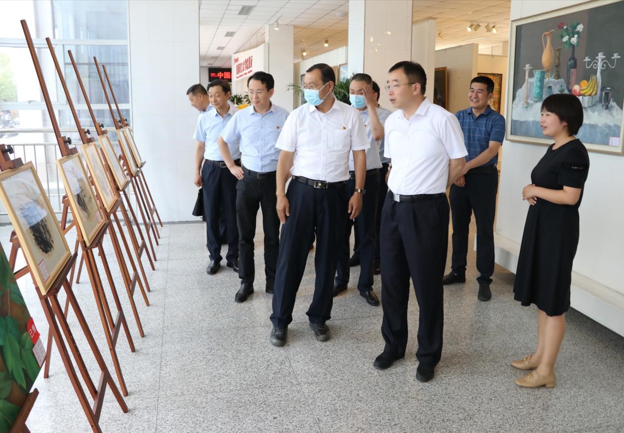 6月2日下午,董事长张守华、副董事长曹强一行到Bsports必一体育指导2022届美术学专业92名毕业生作品展。