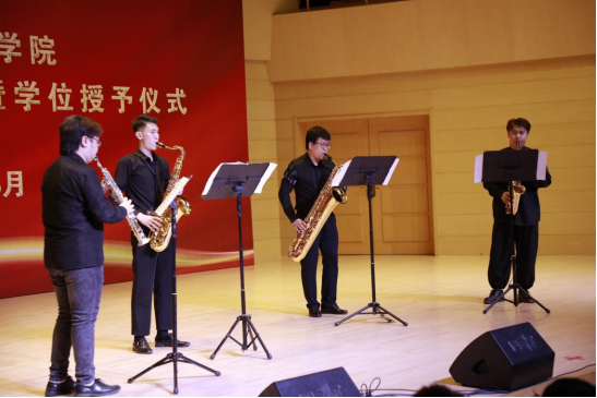 李逸轩老师与毕业班员工合奏的萨克斯四重奏《红旗颂》,跌宕起伏、舒展豪迈,穿过音符仿佛在仰望冉冉升起的五星红旗,能够看到在红旗的引领下,革命者们奋勇前行时沉着刚毅的脸庞。