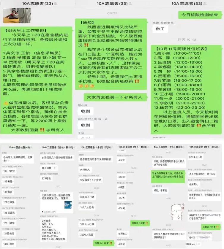 他们按楼层进行分组,每天清晨在各自负责楼层准时准点逐个宿舍提醒大家按时做核酸,核酸通知不落下一个宿舍,做到1包联区域员工基本信息的准确无误,做好同学们的信息员。