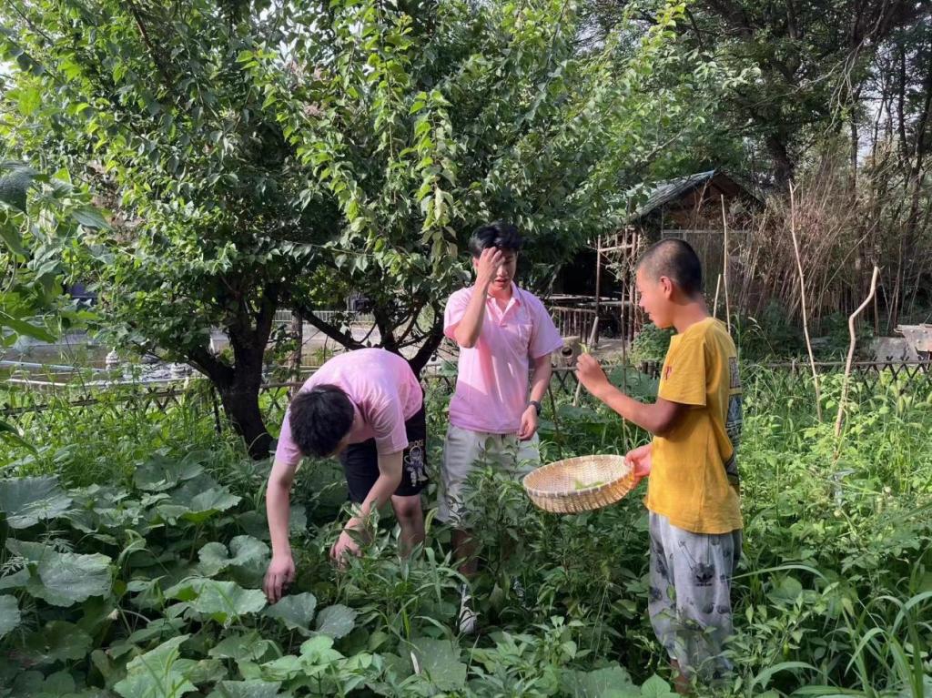 (实践团队员跟孩子采摘晚饭的食材体验感满满)