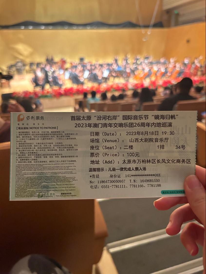 作为一名音乐专业的员工认为,假期是最适合去外界学习,长见识的最佳时期。在大一暑假的尾声8月18号晚上有幸在山西大剧院音乐厅听了一场音乐会,首届太原“汾河右岸”国际音乐节“镜海归帆”——2023年澳门青年交响乐团26周年内地巡演。