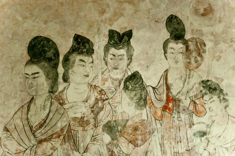 场面宏大、保存较好,画中人物为9位风姿绰约的宫女。她们头梳高髻,肩披纱巾,长裙曳地,个个体态丰盈、婀娜多姿。宫女们或低语,或回顾,或凝神,神态被描绘得细致入微、生动传神。