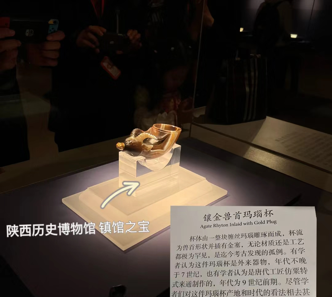 它也是陕西省历史博物馆的镇馆之宝。兽首玛瑙杯造型写实、生动,静中含动,极富艺术感染力。从选材、设计到工艺,都可称为唐代玉雕艺术的精品,是至今所见的唐代唯一一件俏色玉雕,是唐代玉器做工最精湛的一件,也是唐代中外文化交流的产物。这件作品融合我我国古代匠人的心血与智慧,也展现出我国古人的工资精湛以及丰富的想象力,他们的创作能力不局限于时间,环境以及工具等硬性条件的影响,为我们留下了一笔宝贵的财富。