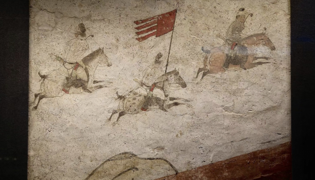 章怀太子墓从墓道入口至墓室后壁总长71米,在墓道及墓室壁上共绘有54幅壁画,约400平方米。《狩猎出行图》位于墓道东壁,由于画面巨大,人们揭取时将其分割成了四块。宽大的墓壁上描绘出山间野外声势浩大的狩猎出行场面。整个画面布局虚实相间、疏密有致,疏处不显其空,密处不显其乱。中间密集的人马队伍,通过马匹颜色、人物服色的变化,形成了有节奏的动感。人物动作、表情不同,彼此呼应。马蹄嗒嗒,旌旗猎猎,人马喧闹着从山林中穿过。