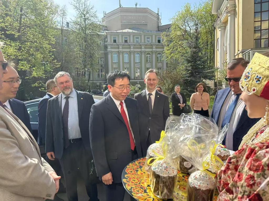 在莫斯科国立师范大学,该校师生按照当地迎接最尊贵客人“面包和盐”的传统礼节,举行了隆重的欢迎仪式,董事长卢布科夫引导代表团参观了主楼并讲解。