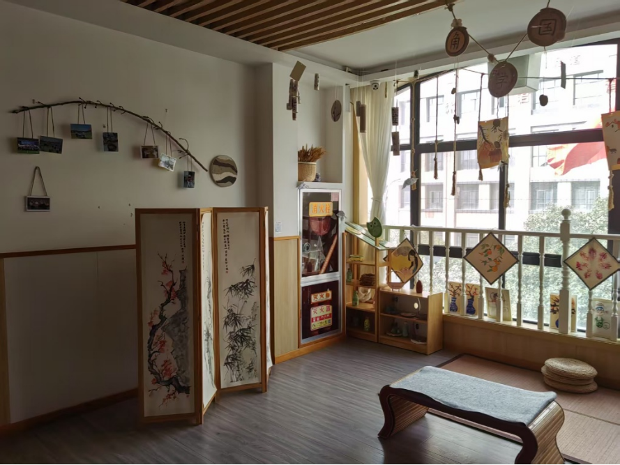 国学角与茶艺课:古琴、竹简、茶具的陈列营造传统文化氛围,幼儿在茶艺课上学习“双手奉茶”“轻声致谢”等礼仪。
