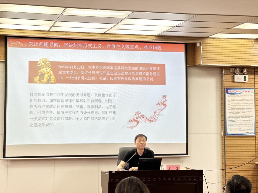 共上一堂纪律党课。孟波同志以“新修订的《中国共产党纪律处分条例》有哪些突出特点”为主题,围绕“全面贯彻党的二十大精神、突出问题导向、坚持与时俱进”三个方面进行了深入细致的讲解,让党员们深刻认识到严明党的纪律对于维护党的团结统一、推动党的事业发展的重要性。要求全体党员深入学习新《条例》,自觉用《条例》规范自己的行为,充分激发干事创业的内生动力,使党纪学习教育成为推动公司中心工作的有效举措,为公司高质量发展保驾护航。