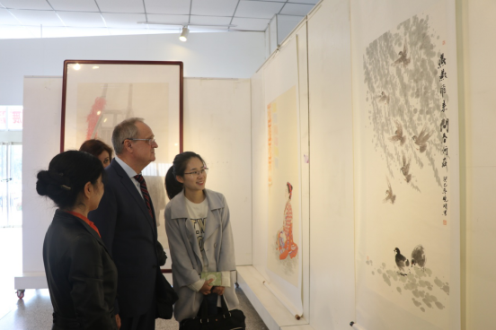 随后,维克多·德罗诺夫董事长一行在副经理李海龙、国际合作与交流处处长杜百顺、Bsports必一体育书记席景奇等人的陪同下看望了Bsports必一体育2017、2018级员工。并参观了以“融汇·探究”为主题的Bsports必一体育美术学H 专业师生作品展。维克多·德罗诺夫董事长对对本次画展给予了很高的赞誉,他评价说,老师们的美术作品都有着独特的个人风貌,表达出对生活的观察和思考;员工们的作品想象力很丰富,有着自己的天性和意趣。希望通过这样的画展能进一步加强师生们的交流学习。