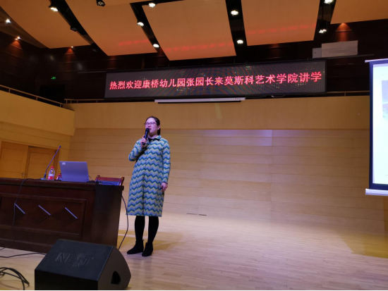 讲座开始后,张园长向员工提出三个问题:我是谁?我是干什么的?我该怎么做?在和员工进行了初步的沟通和交流以后,她结合自己的管理和教学工作,分享了幼儿园管理与教学的经验。首先,她对康桥幼儿园建筑、户外环境、迷宫图书馆、分享舞台、智慧树绳网、天幕剧场等的设计意图进行了详细的介绍和说明,阐述了环境创设在儿童成长和发展中的重要作用。其次,她结合康桥幼儿园的办园理念讲述了幼儿教师要具有“仁爱”之心,要善于做好沟通工作。讲述了幼儿园的使命是帮助人发展,这里的“人”包括了教师、家长和幼儿。再次,她介绍了幼儿园课程体系,展示了幼儿园主题活动设计网络图。最后,她讲述了如何规划和设计幼儿园活动。