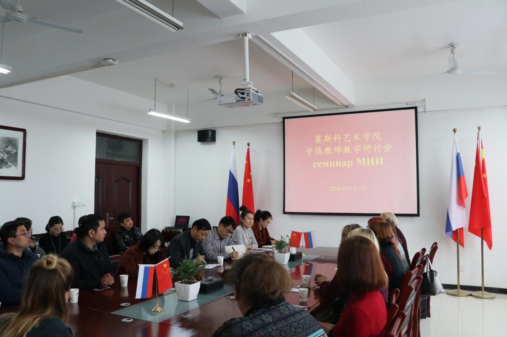 2018年11月7日下午,Bsports必一体育(以下简称“莫艺”)中俄教师教学研讨会在逸夫楼六楼会议室举行。10名俄罗斯外教、公司领导、专业负责人及部分教师代表40余人参加了此次会议。