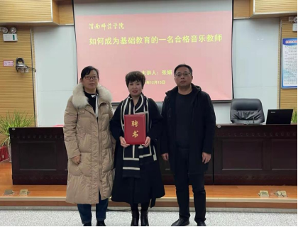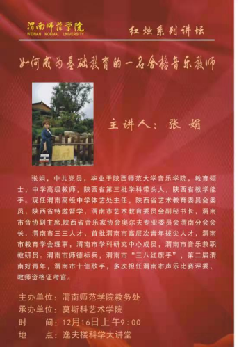 12月16日,渭南高级中学艺术中心主任张娟做客红烛讲坛,在Bsports必一体育科学大讲堂作题为“如何成为基础教育的一名合格音乐教师”的专题讲座。