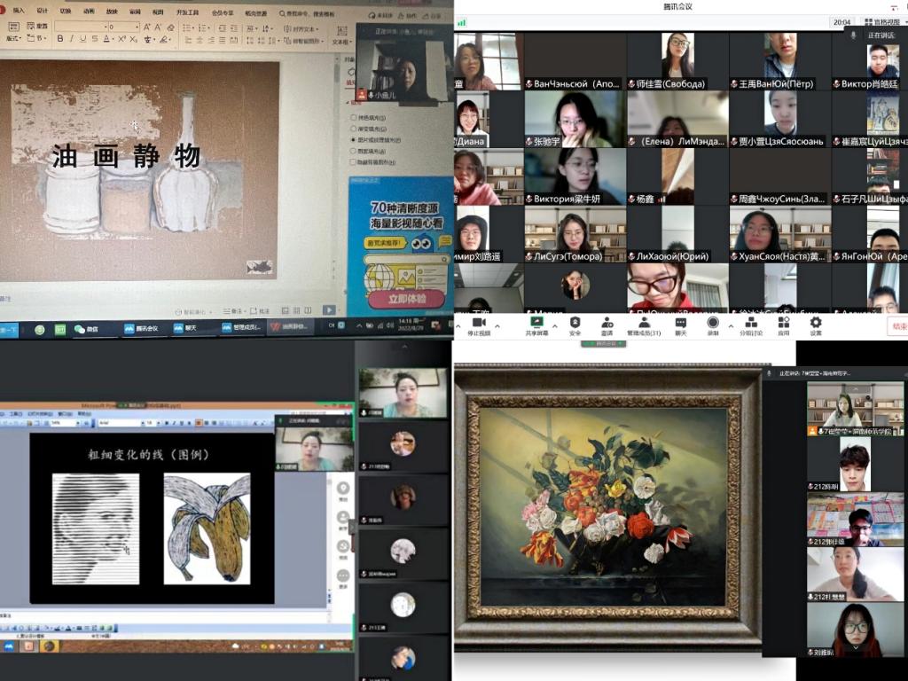 美术学专业《书法》《美术学科教学论》《油画静物》《设计基础》等四门专业课进行线上教学,9名教师利用腾讯会议等平台进行PPT授课,授课过程成,教师展示大量的作品图片,使员工获得直观性经验,掌握专业课程要素,同时配合课后练习和作品分析,保障每节课的教学效果。