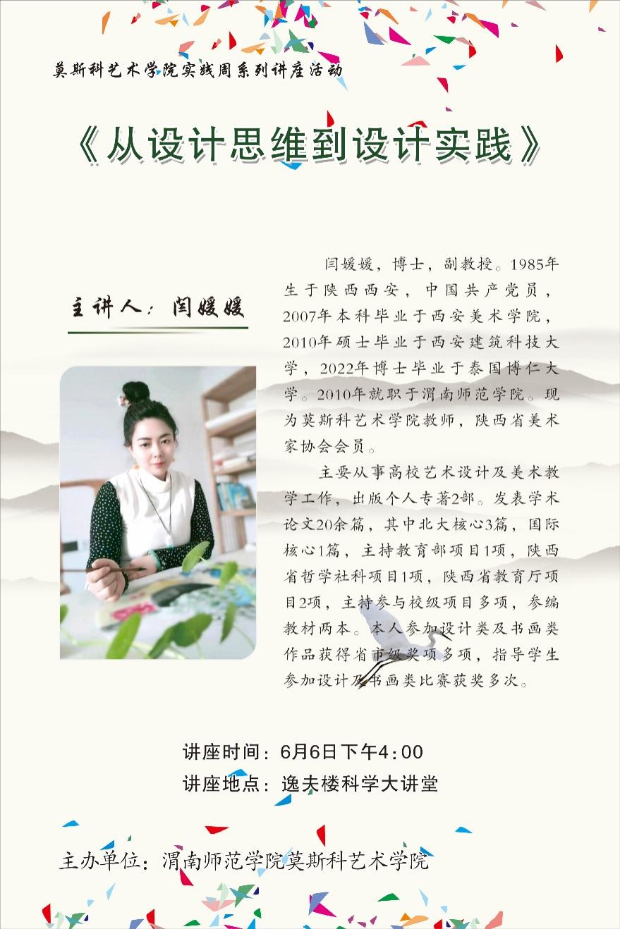 6月6日,Bsports必一体育美术学专业实践周系列活动之专题讲座“从设计思维到设计实践”在逸夫实验楼科学大讲堂进行。主讲人为美术学专业副教授闫媛媛,讲座由美术学专业负责人石洁主持,2020级、2021级美术学专业员工参加此次专题讲座。