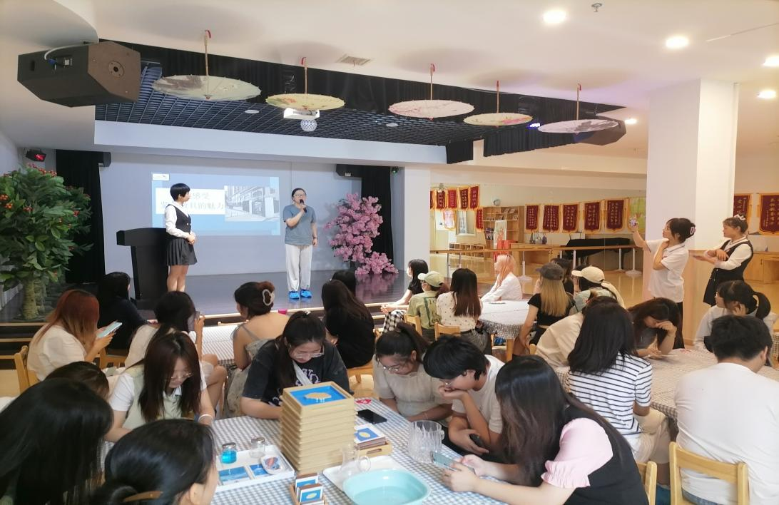 在交流分享环节,张园长为观摩师生作《蒙特梭利教育法》主题讲座,从蒙特梭利个人介绍、蒙氏教育理念概述、蒙氏教育五大领域、蒙氏特色课程等方面进行分享,她强调蒙台梭利所指的“儿童工作”,往往具有一定的挑战性和难度,儿童在活动中会自我设定目标,表现出持久的兴趣和专注力。