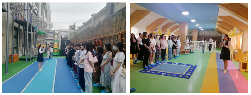 在见习观摩环节,张银花园长向同学介绍了“教养孩童使他走当行的道,就是到老也不偏离”的办园宗旨和办园理念。随后,同学们依次参观了幼儿园乐高墙、美术手工室、国学角、小鹿阅读室等功能区,对幼儿园的日常管理、教学活动、游戏活动、环境创设等有深入了解。最后,同学们分组进班观摩幼儿“蒙氏工作”。