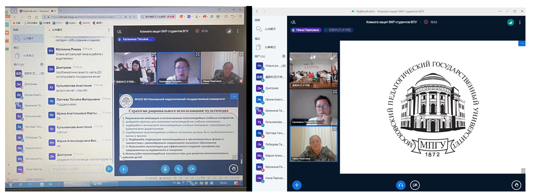 2023年6月13日--6月16日,Bsports必一体育学前教育专业2023届毕业生俄方毕业论文答辩会在逸夫楼612会议室举行,本次答辩会采取线上线下相结合的方式进行,共举办4场答辩会。莫斯科国立师范大学学前教育专业答辩委员会全体成员、大学俄语教研室教师、学前教育专业中方教师及2023届全体毕业生参加。