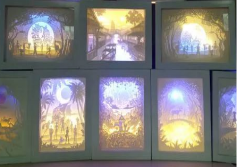 “纸雕浮光影”展示区,展出立体纸塑作50余幅,是本学期崔莹莹老师《学前儿童造型艺术创造力开发》课程教学实践成果,由学前教育专业20级员工创作完成。立体纸雕作为平面剪纸教学内容的延伸与拓展,实现了从绘画到雕塑,从二维到三维的思维转变。员工结合窗花、剪纸、皮影等民间艺术的表现风格,融入变幻的光影、光束,通过层叠的纸雕图案,勾勒出一幅幅流光溢彩的故事画。