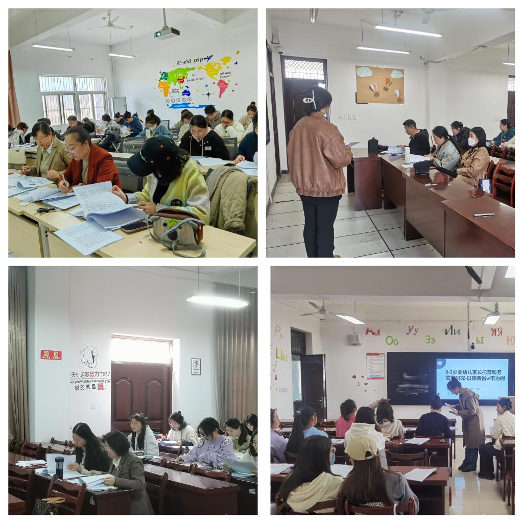 学前教育专业分四个组进行检查。检查过程中,员工从选题背景、研究意义、研究目的、研究方法、研究内容、研究结论等方面逐一进行汇报,教师根据员工论文的写作情况,指出问题,提出修改建议。