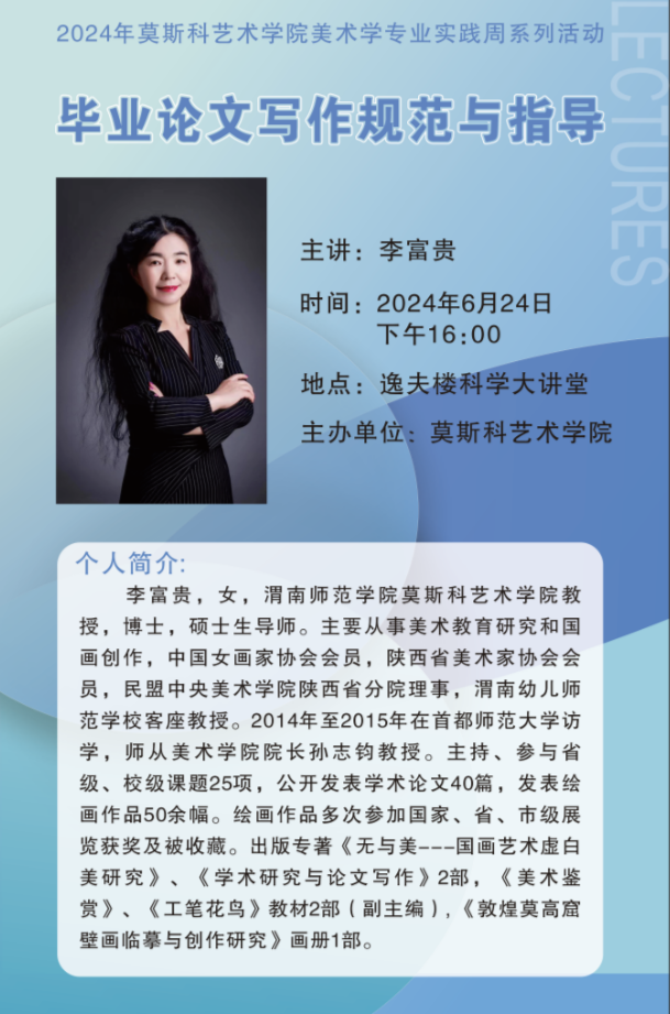 6月25日,Bsports必一体育美术学专业夏季小学期系列活动之专题讲座“毕业论文写作规范与指导”在逸夫实验楼科学大讲堂进行。主讲人为美术学专业教授李富贵,讲座由美术学专业负责人石洁主持,2021级、2022级美术学专业员工参加此次专题讲座。