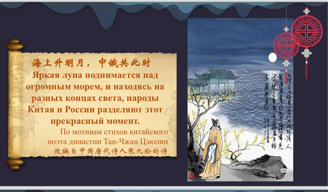 Перефразируя слова великого китайского поэта династии Тан - Чжан Цзюлин, я хочу сказать: «Яркая луна поднимается над огромным морем, и находясь на разных концах света, народы Китая и России разделяют этот прекрасный момент».