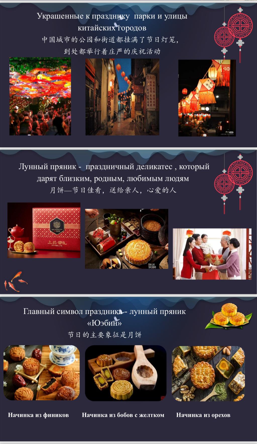 在这一天,中国城市的公园和街道都装饰着节日的灯笼,各地举行庆祝活动,中国人走进大自然以便与亲人共度时光吃一种特别的美食——月饼。