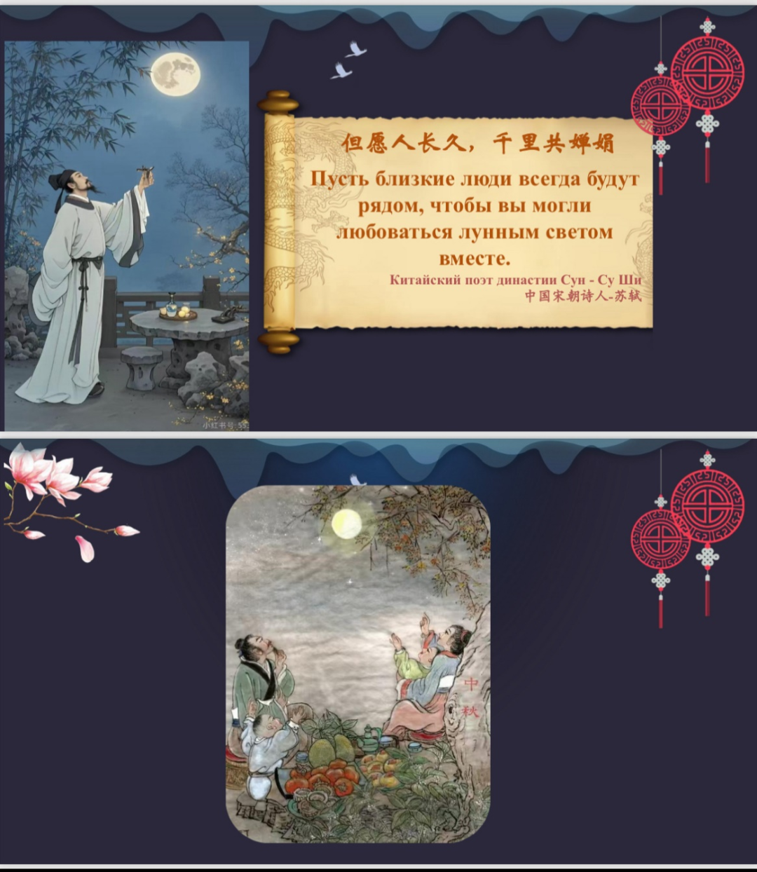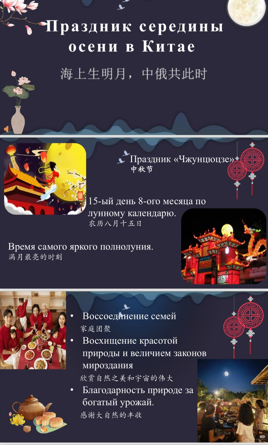 Сегодня , когда мы говорим о величии китайской культуры и важности её сохранения, я расскажу вам об одном из самых значимых в Китае фестивале - празднике середины осени. Этот праздник является для меня и моей семьи одним из самых любимых.