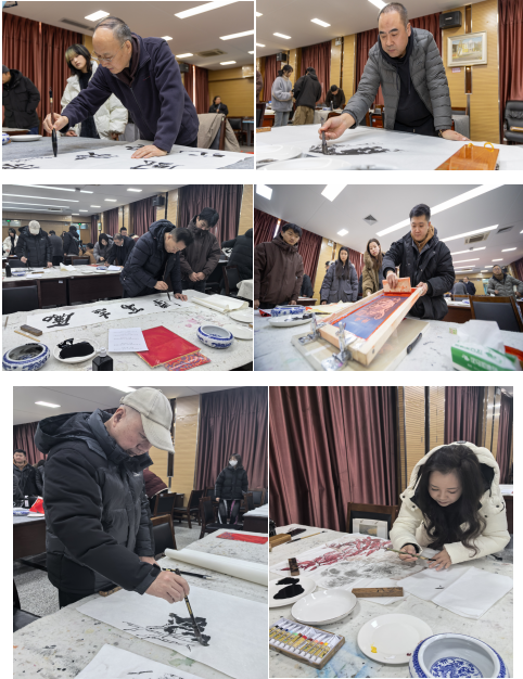最后,与会艺术家在逸夫楼科学大讲堂开展美术学专业示范教学。双方以笔为媒,蘸墨为韵,进行了国画、书法、版画创作,并向公司赠送墨宝,浓厚的文化氛围悄然氤氲。