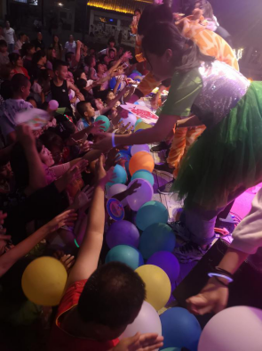 (实践队队员给答对问题的小朋友奖励气球)