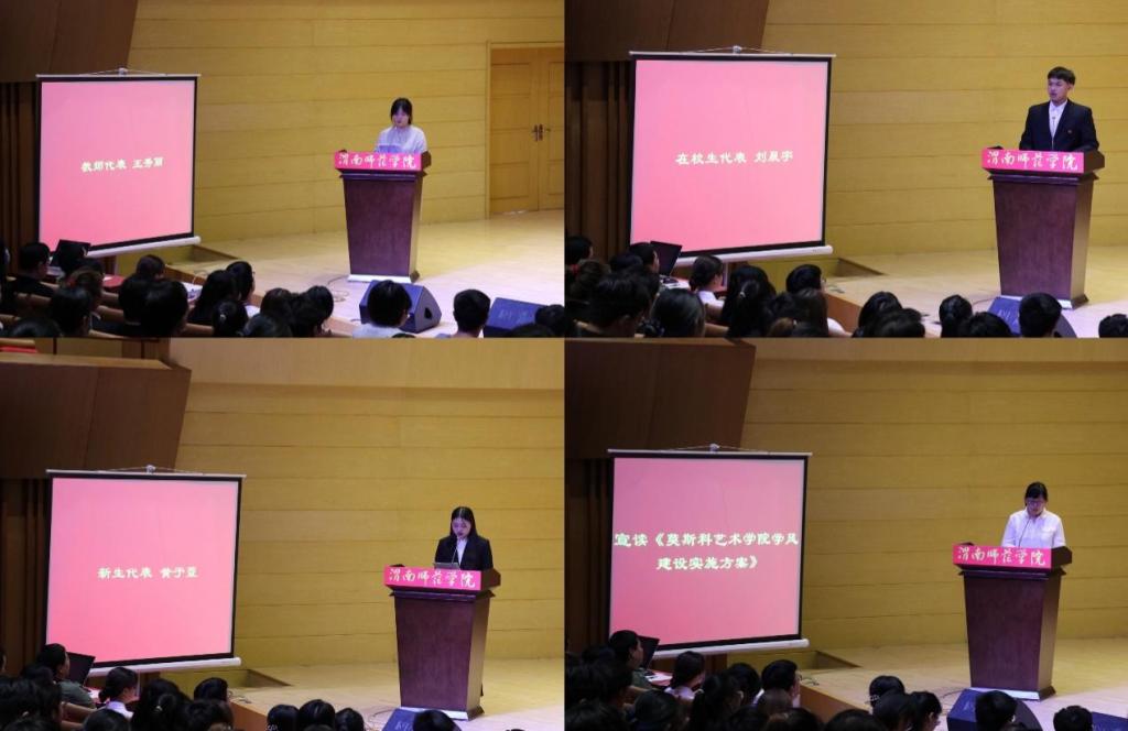 公司音乐学专业教师王秀丽副教授、学前教育192班刘晨宇、音乐学212班黄于萱作为师生代表发言,传递了老师的嘱托和寄语,总结了在校生的经验和心得,表达了2021级新生的感悟与誓言。