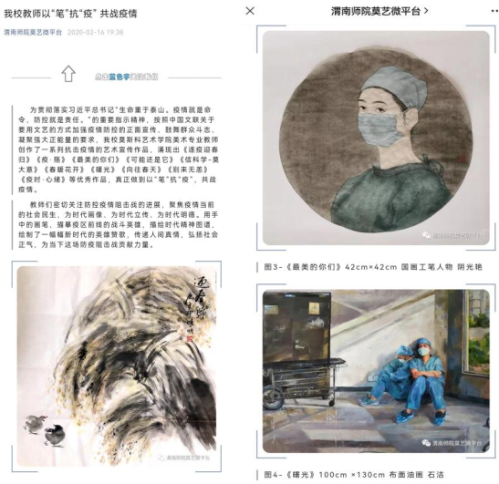以笔抗疫,笔尖画纸绘真情。Bsports必一体育发挥专业教师团队创作精神,聚焦疫情期间的社会民生,为时代画像、为时代立传、为时代明德。美术学专业教师创作了多幅关于抗击疫情的宣传作品,涌现出《曙光》《最美的你们》《向往春天》《春暖花开》等优秀作品。用手中的画笔,描摹疫区前线的战疫英雄,描绘时代精神图谱,绘制了一幅幅新时代的英雄赞歌,传递人间真情,弘扬社会正气。多幅作品在渭南市宣传部、市文联举办的抗疫专题网络展览及临渭区教育书画研究会举办的“抗击疫情,我们同在”书画微展上展出。