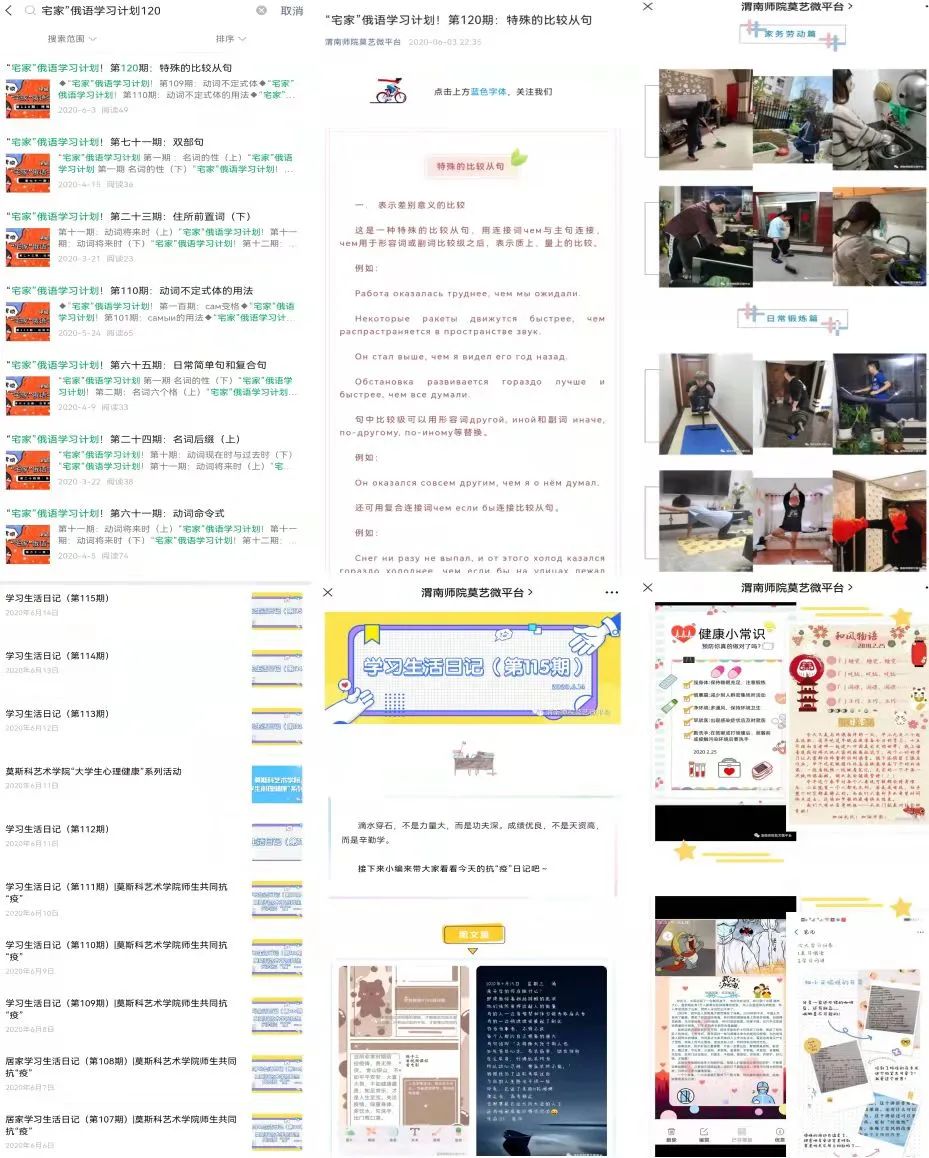 以文抗疫,宅家有方顾大局。公司持续推出寒假、暑假社会实践、专业实践活动实施方案,形成“学期+假期”“线上+线下”“课内+课外”的思想政治教育模式,针对疫情形式开展线上多元化的“宅”家系列活动,积极引导员工科学“宅”家生活,使“宅”家计划顺利进行。通过莫艺官方微信平台推出“宅”家俄语学习计划120期;家务劳动篇、日常锻炼篇等学习生活日记123期。莫艺学子全员响应,立即行动,主动作为,乐观向上,从容自信,充分展现出这个伟大的时代赋予青年的精神力量,用实际行动证明自己有志做一个有社会责任感、有使命担当的新青年,为抗击疫情传递一份光和热。