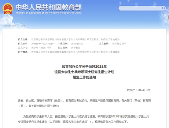 为激励高校员工投身军旅、助力退役老员工士兵长远发展,近日教育部办公厅印发《关于做好2025年退役老员工士兵专项硕士研究生招生计划招生工作的通知》,持续推行“退役老员工士兵计划”专项硕士研究生招生项目。相关工作通知要点如下。