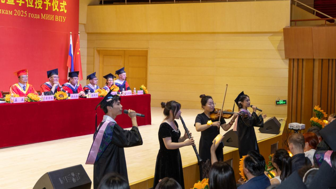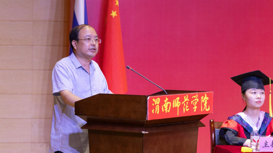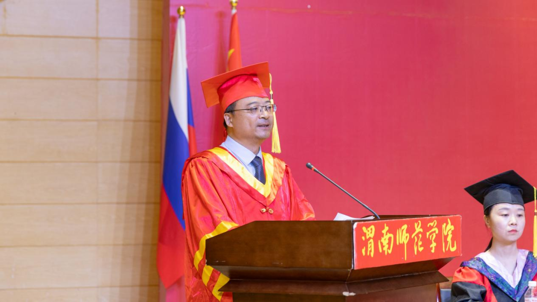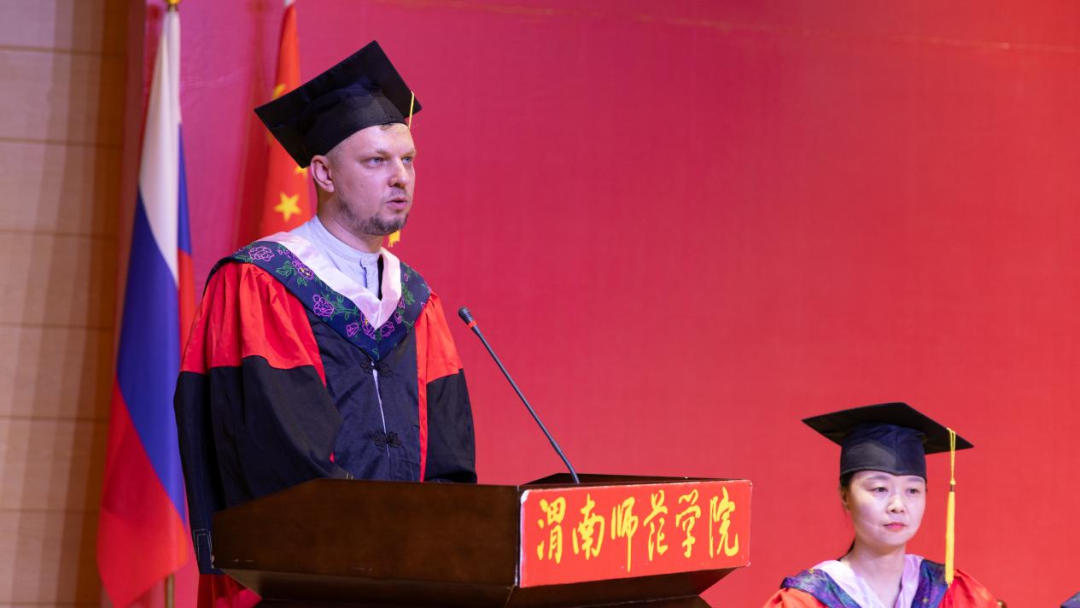 俄方教师代表阿里克谢代表发言,祝贺毕业生圆满完成学业,为毕业生送上祝福,并分享了自己在中国的教学经历与感悟。阿里克谢鼓励毕业生们在未来无论走到哪里,都要保持开放的心态,勇于探索未知,积极传播中俄友谊,成为连接两国文化的使者。他的发言充满了深情与期望,赢得了在场师生的热烈掌声。