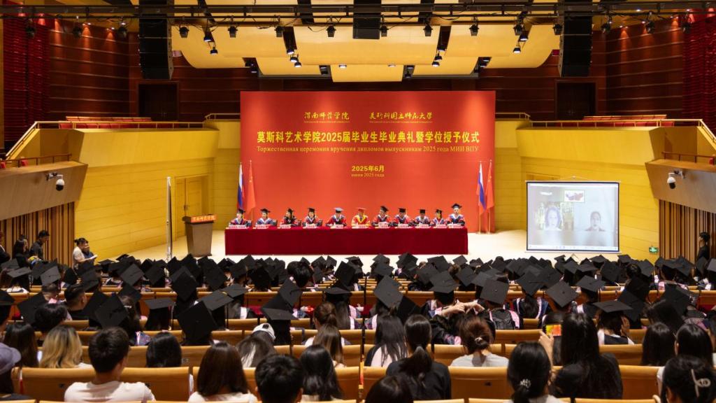 毕业典礼在庄严的国歌声中拉开序幕。俄罗斯莫斯科国立师范大学俄中统筹中心主任叶列娜·马克耶娃致辞,祝贺大家顺利完成学业,向为同学们成长成才呕心沥血、辛勤付出的老师表示衷心感谢,欢迎更多的莫艺学子继续升学深造,真诚地祝愿2025届毕业生有一个光明而美好的未来。