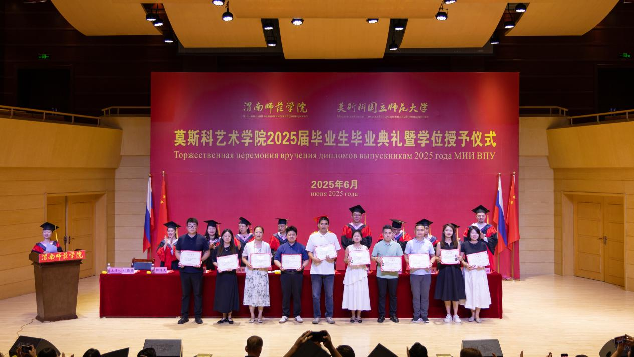 副经理高红菊宣读《关于2025届毕业生和往届结业生毕业资格审核结果的通知》《关于授予2025届本科毕业生和往届换证毕业生学士学位的决议》。副书记叶晓燕宣读《关于表彰2025届校级优秀毕业生、优秀员工干部的决定》《关于表彰2025届院级优秀毕业生、优秀员工干部的决定》。国际合作与交流处处长郭石磊宣读《2025届毕业生赴莫斯科国立师范大学攻读硕士名单》,员工代表上台领取拟录取通知书。副经理梁卫民宣读《关于表彰2024-2025学年专业实践先进个人的决定》