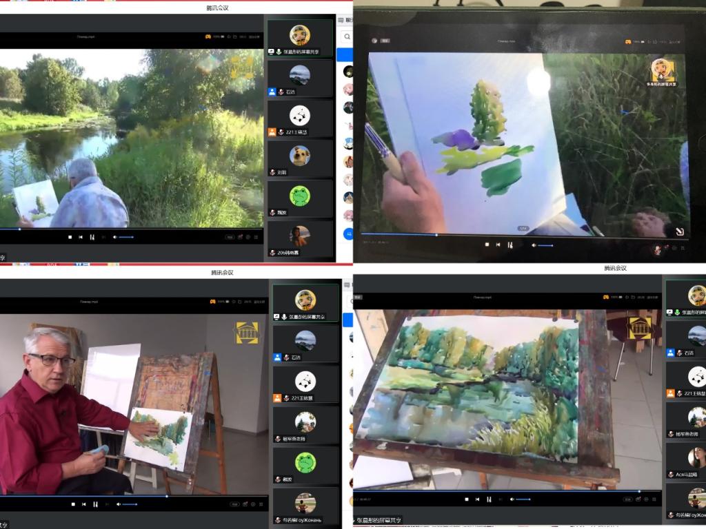 洛莫夫教授2009年当选为俄罗斯教育公司普通中等教育系院士兼秘书长,在美术教育领域卓有成就、影响力广泛。讲座中,他亲自示范水彩画风景写生,从取景、构图、用色等方面一一细致讲解,展示了水彩画的详细创作过程。洛莫夫教授边做示范边讲解每个步骤的要素,着重强调了写生时要仔细观察、用心描绘,用色彩去表现自然风景丰富的色彩关系。