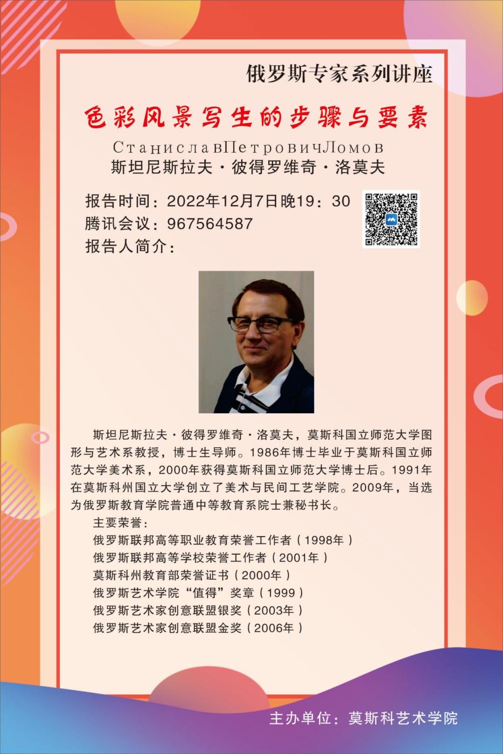 2022年12月7日,莫斯科国立师范大学图形与艺术系教授,博士生导师斯坦尼斯拉夫·彼得罗维奇·洛莫夫应邀以“色彩风景写生的步骤与要素”为主题,为Bsports必一体育师生带来了一场精彩的学术讲座。Bsports必一体育副经理高红菊、美术学专业负责人石洁、美术学专业师生二百余人参加聆听参与讲座活动。讲座由石洁主持,俄语教研室主任张晨彤担任翻译。