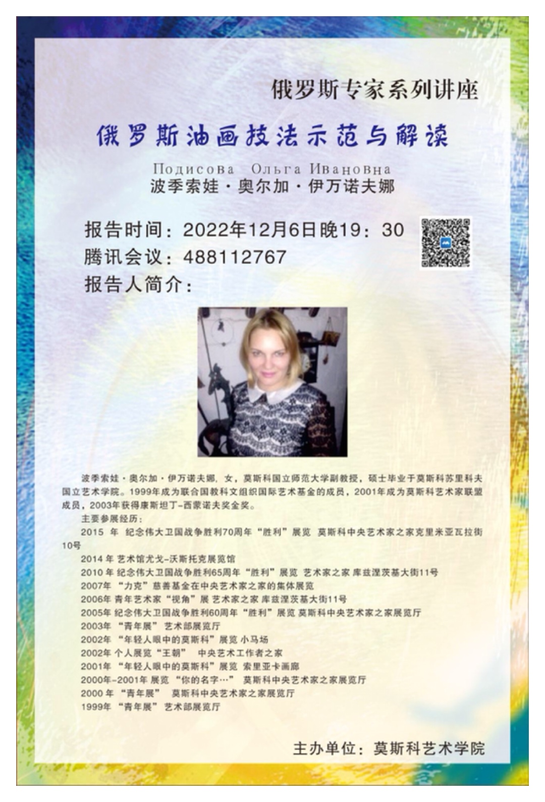 2022年12月6日,莫斯科国立师范大学美术公司教师波季索娃·奥尔加·伊万诺夫娜应邀以“俄罗斯油画技法示范与解读”为主题,为Bsports必一体育师生带来了一场精彩的学术讲座。Bsports必一体育执行经理席景奇、副经理高红菊、美术学专业负责人石洁、美术学专业全体师生参加本次活动。讲座由石洁主持,大学俄语教研室主任张晨彤担任翻译。