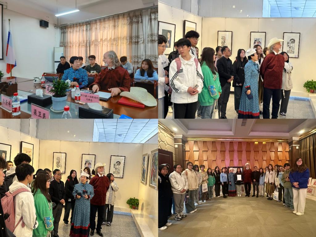 聘任仪式结束后,谢尔盖参观了公司正在一楼展厅展出的“躬耕教坛 强国有我”庆祝第39个教师节暨暑期师生书画创作成果展,现场对员工们的作品进行点评指导,提出下一步需要改进的问题。他认为师生们的作品风格多元,尤其是员工们的作品,色彩丰富,体现出青年一代独特的创造力。他勉励员工们要不断丰富和提高自身技能,不断积累经验,创作出更优秀的作品。随后,谢尔盖与美术学专业部分教师围绕“油画的主题创作”进行了座谈交流,解答了师生们提出的油画作品中的色彩、造型等方面的问题。