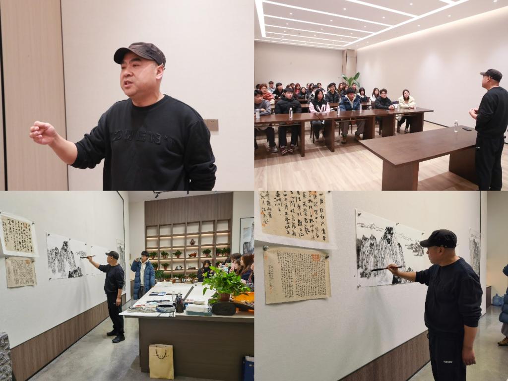 师徒制教学活动分三个阶段展开:第一阶段,党宽阳为员工讲述从事艺术创作的必经之路;第二阶段,在松•美术馆针对作品进行分析和解读;第三阶段,在工作室为员工现场进行现场示范。通过党宽阳现场示范一幅山水画的创作步骤,员工们表示收获很大,直观感受到图像到创作的转换过程,对今后的创作很有启发意义。最后,党宽阳主席叮嘱员工们多看、多想、多练。通过听一段美术历史、赏一些世界名画,不断提高自己的艺术修养。他希望员工们不负韶华,创作出一系列表现时代精神的力作。